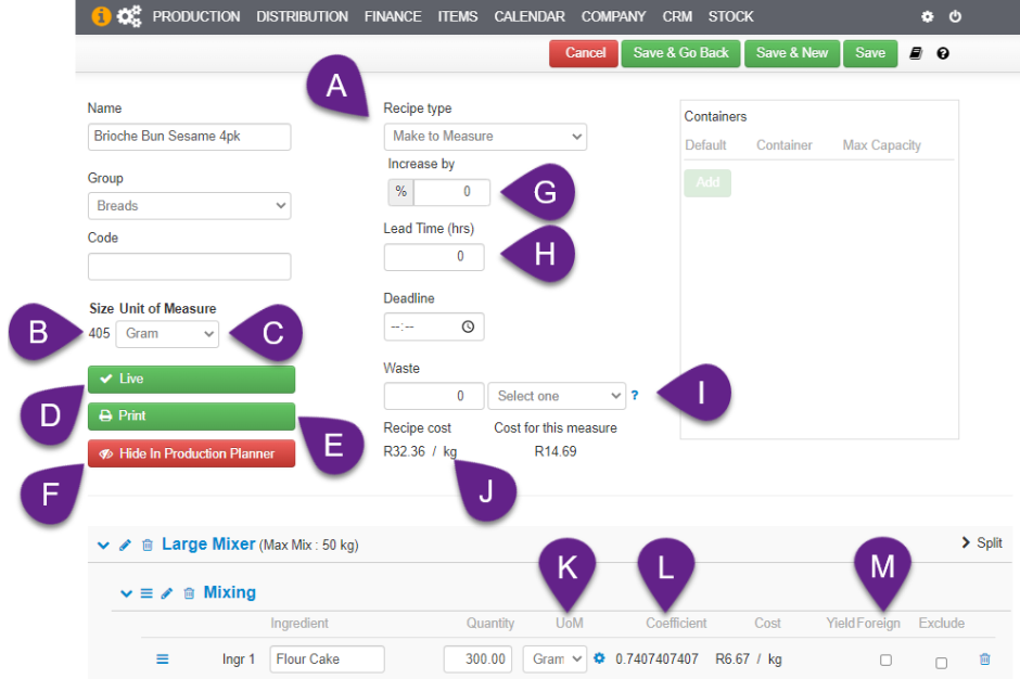 Choose the UoM to use in Recipe Cards and Totals. NB: if you work in metric, grams and kilos are available and oz and lbs, if imperial.