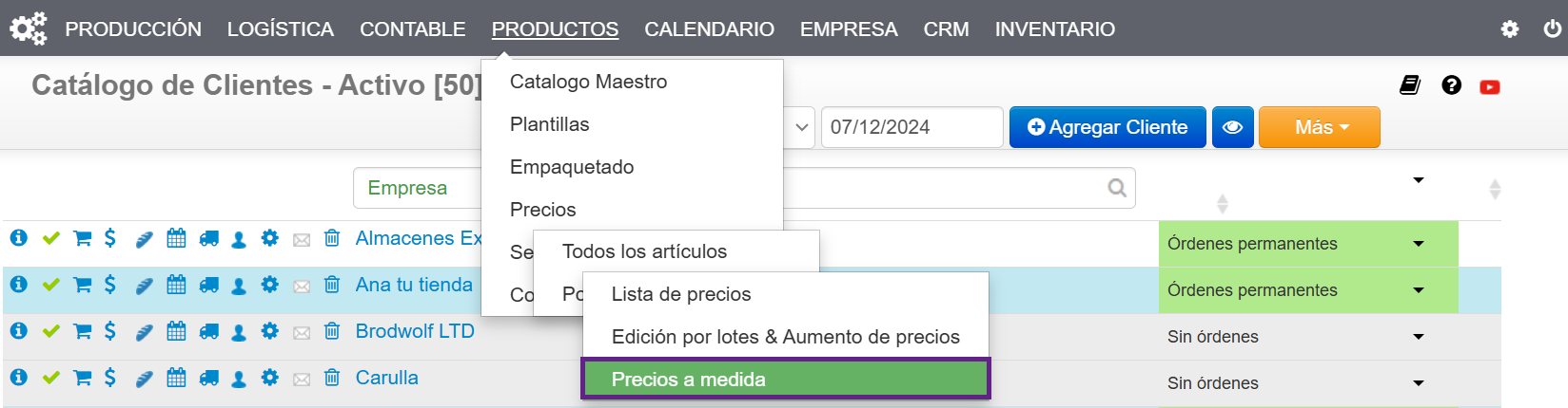 [ Artículos > Artículos Precios > Editar Lote ]: Una vista matricial de múltiples clientes y múltiples artículos.